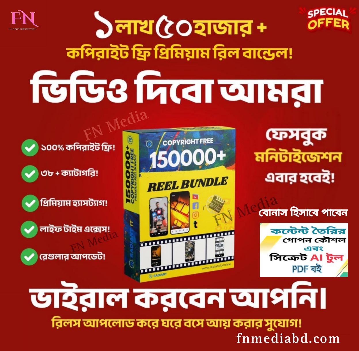🟢পেমেন্ট কমপ্লিট হওয়ার সাথে সাথে আপনার ইমেইলে ডাউনলোড লিংক চলে যাবে , আপনি রিল বান্ডেলের লাইফটাইম এক্সেস পাবেন। ১ লক্ষ ৫০ হাজারের বেশি প্রিমিয়াম কপিরাইট ফ্রি রিল বান্ডেল। আপনি ফেসবুক, ইউটিউব, টিকটক এ সহজেই আপলোড করতে পারবেন।